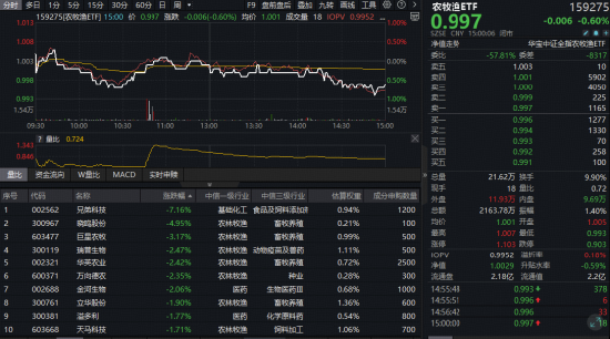 成份股方面,畜牧养殖、动保、食品及饲料添加剂等板块部分个股跌幅居前。截至收盘,兄弟科技大跌7.16%,晓鸣股份跌近5%,巨星农牧跌超3%,瑞普生物、华英农业、万向德农等多股跌超2%。
