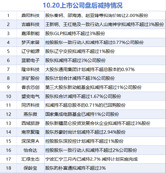 据统计,10月20日,盘后暂无A股上市公司披露增持情况。包括鼎阳科技、吉峰科技、嘉泽新能、梦天家居、辽宁能源、蓝箭电子、隆华科技、浙矿股份、香农芯创、望变电气、同济科技、燕东微、西域旅游、南京聚隆、深深房A、怡合达、汇绿生态、保龄宝在内的18家A股上市公司披露减持情况。