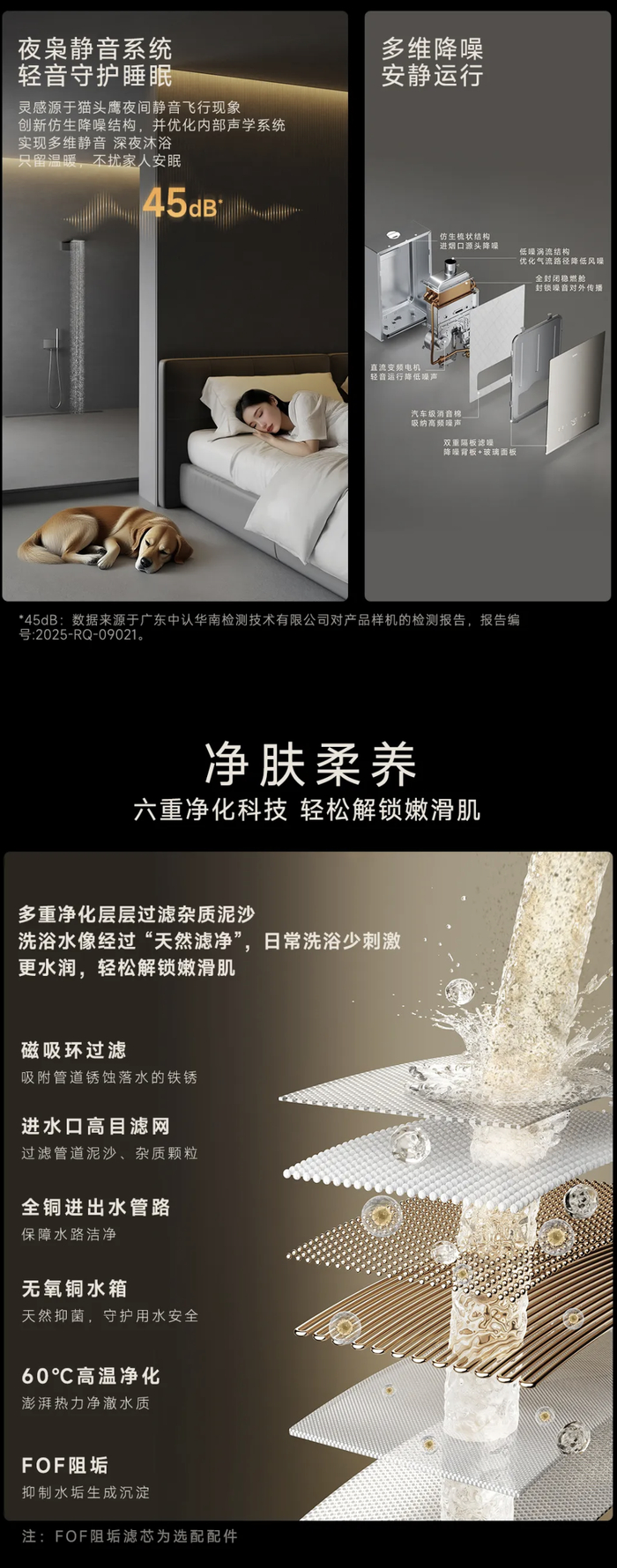 官方称该产品采用镜影灰造型,搭配 AG 肤感材质,内置 0.77L 恒温仓和双循环水路实现恒温效果。热水器噪音约 45dB,同时提供多重安全保护功能。