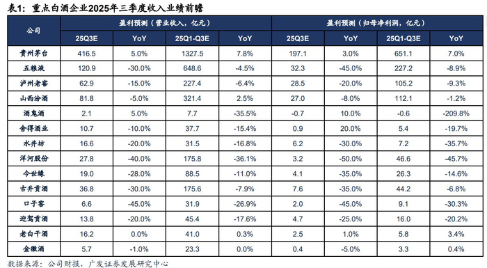 上周,广发证券发布《白酒持续调整,大众品表现分化——2025年三季报业绩前瞻》研报,对白酒上市公司三季度业绩进行了详细预测分析。总体来看,广发证券认为,步入8月后,随着政策在执行层面的规范与完善,白酒需求环比有所改善,但同比仍承压。从经销商回款进度看,预计厂商博弈下,多数厂家放松回款要求/不再强制性要求打款,部分头部酒企表现相对较优。