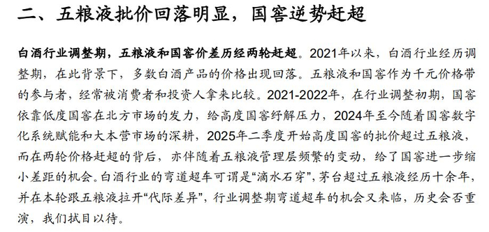 广发证券分析指出,2021年以来,白酒行业经历调整期,在此背景下,多数白酒产品的价格出现回落。五粮液和国窖作为千元价格带的参与者,经常被消费者和投资人拿来比较。