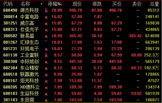 CPO概念等AI产业链股集体走高,截至收盘,源杰科技20%涨停,中富电路、威尔高涨超15%,新易盛涨超10%,工业富联、中际旭创等涨逾9%。