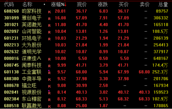 消费电子概念盘中走势活跃,苹果概念股表现亮眼。截至收盘,昀冢科技20%涨停,雅创电子涨约16%,英诺激光涨近12%,山河智能、环旭电子、大为股份、闻泰科技等均涨停。