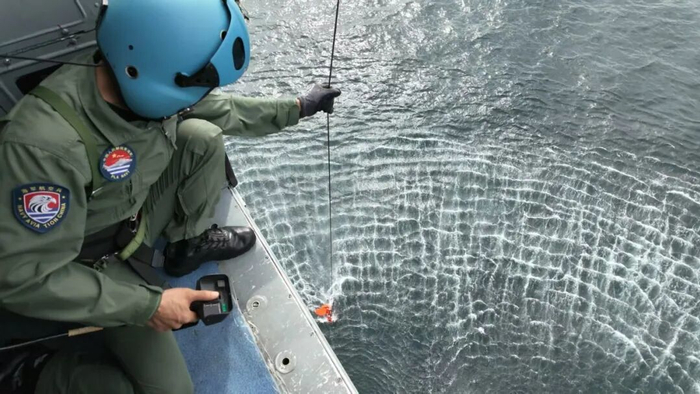 “发现‘落水人员’。”直升机发现目标。随后,机长迅速规划航线,操纵飞机稳稳悬停在“落水人员”上方。中马双方通力配合,救援人员根据涌浪起伏规律,找准时机将“落水人员”救起,并立即后送。
