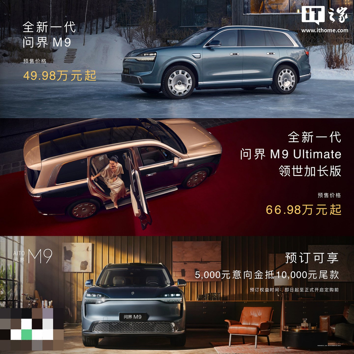 目前,新问界 M9 的外观亮点已曝光,包括全新一代智慧投影大灯、全新一体贯穿灯、全新半隐藏式门把手、全新大饼轮毂 + 悬浮 LOGO 等。